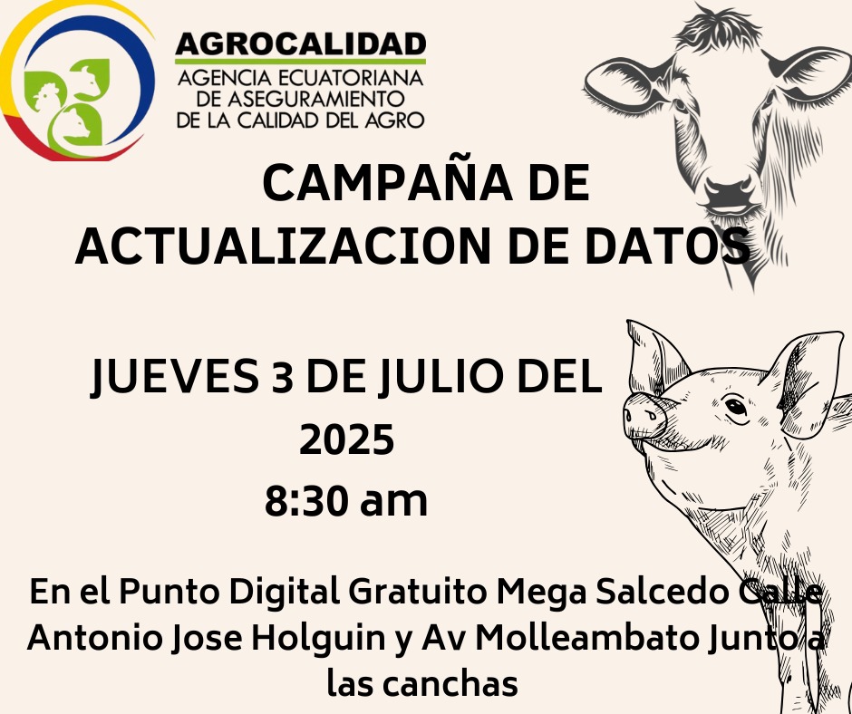 AGROCALIDAD invita a la comunidad a la Campaña de Actualización de Datos el jueves 3 de julio a las 08:30 en Punto Digital Mega Salcedo. Lleva registro de vacunas y cédula para fortalecer el control y la sanidad animal. Ver publicación #FecosSalcedo #GestiónParaElCambio #ComunicaciónFecos