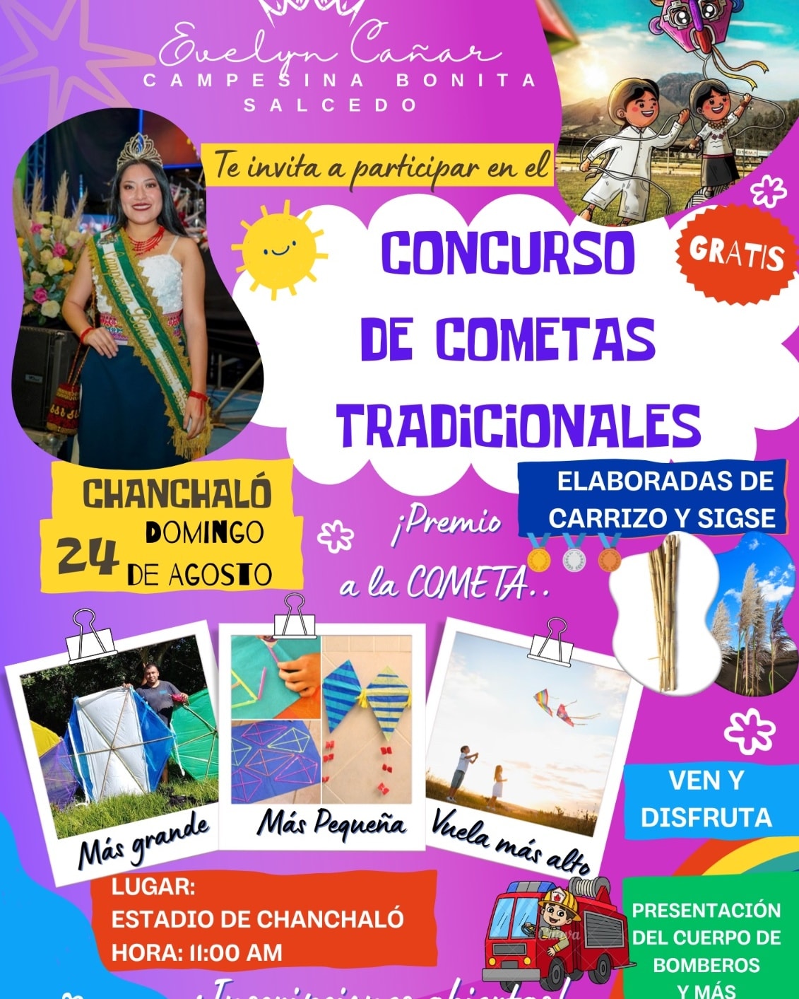 Este domingo 24 de agosto, desde las 11h00 en el Estadio de Chanchaló, participa en el Concurso de Cometas Tradicionales, con premios a la más grande, la más pequeña y la que vuele más alto, disfruta de la presentación del Cuerpo de Bomberos de Salcedo y muchas sorpresas. ¡Inscripción gratuita! Ver publicación #FecosSalcedo #GestiónParaElCambio #ComunicaciónFecos