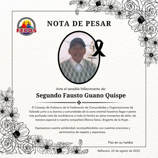 Expresamos nuestra sentida condolencia por el fallecimiento de Blanca Saca, dirigente de la Mujer, y enviamos fortaleza a su familia en estos momentos difíciles. Ver publicación #FecosSalcedo #GestiónParaElCambio #ComunicaciónFecos