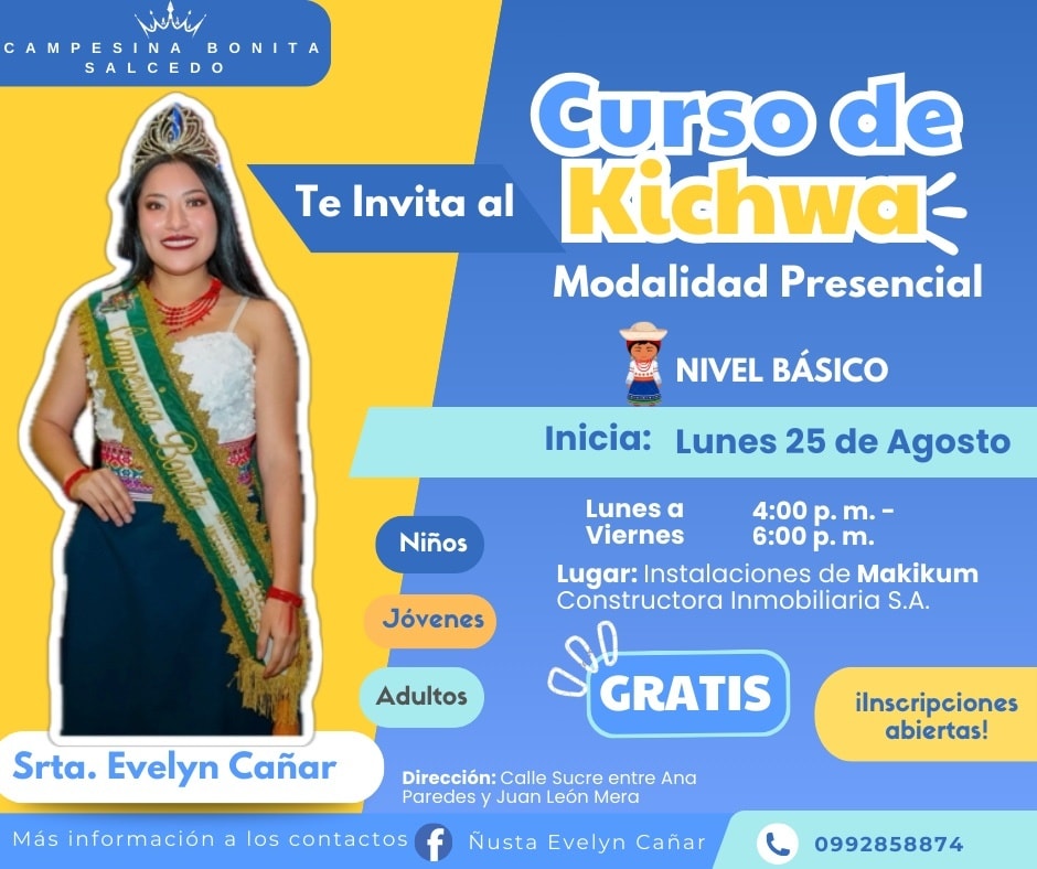 La Campesina Bonita Salcedo, Srta. Evelyn Cañar, invita a niños, jóvenes y adultos al Curso de Kichwa – Nivel Básico, del 25 de agosto en las instalaciones de Makikum Constructora, de lunes a viernes de 16:00 a 18:00, totalmente gratis. ¡Inscripciones abiertas! Ver publicación #Kichwa #CampesinaBonita #AprendeKichwa #FecosSalcedo #GestiónParaElCambio #ComunicaciónFecos