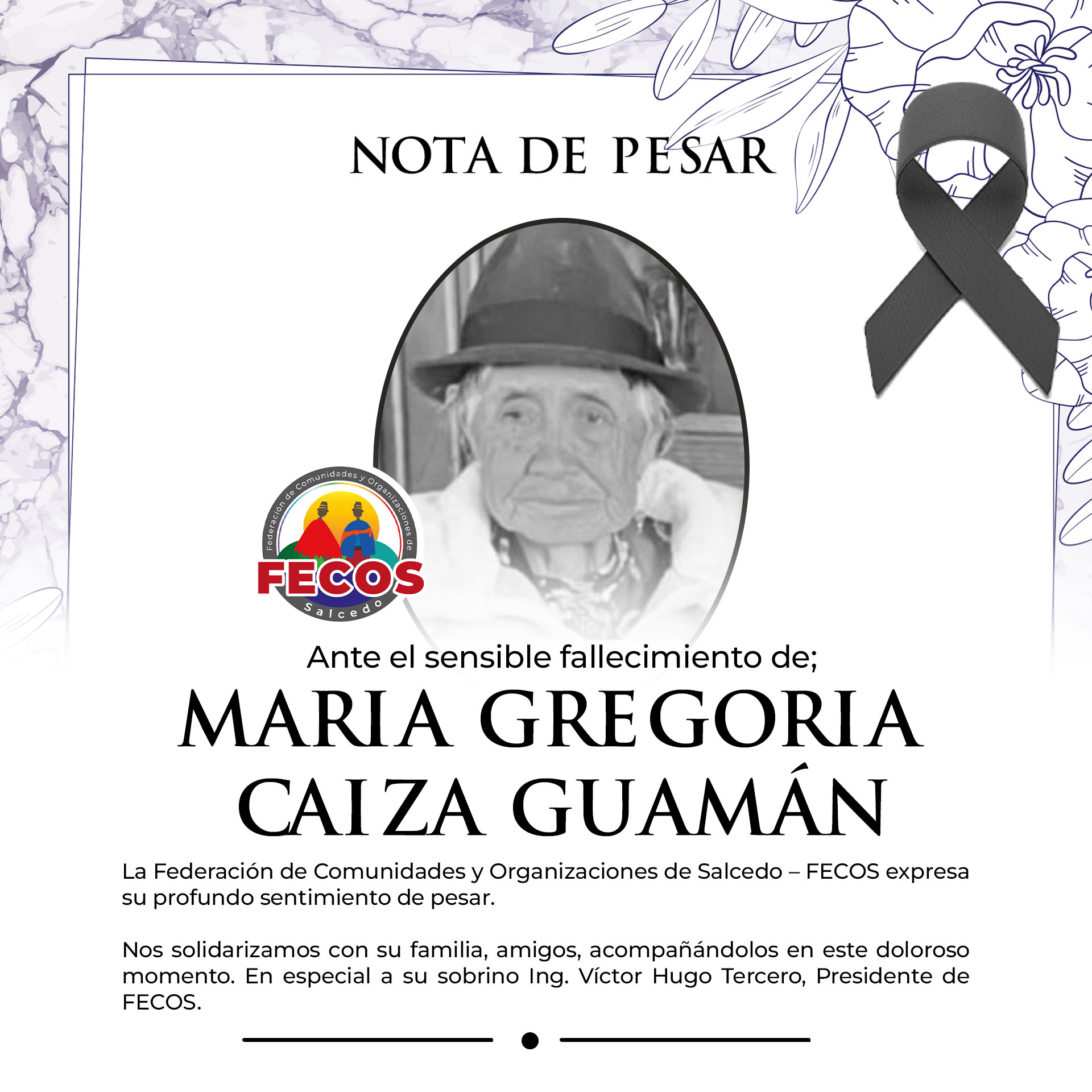 La Federación de Comunidades y Organizaciones del Cantón Salcedo expresa su profundo pesar por el fallecimiento de doña María Gregoria Caiza Guamán, y se solidariza con sus familiares y seres queridos, elevando oraciones por su eterno descanso. Paz en su tumba. Ver publicación #FecosSalcedo #GestiónParaElCambio #ComunicaciónFecos