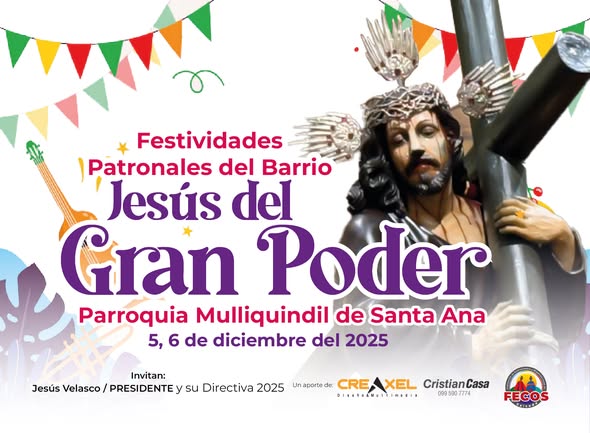 Este 5 y 6 de diciembre de 2025 se celebran las Fiestas Patronales del Barrio Jesús del Gran Poder en Mulliquindil, con jornadas de fe, tradición, música y unión comunitaria. Ver publicación #FecosSalcedo #GestiónParaElCambio #ComunicaciónFecos