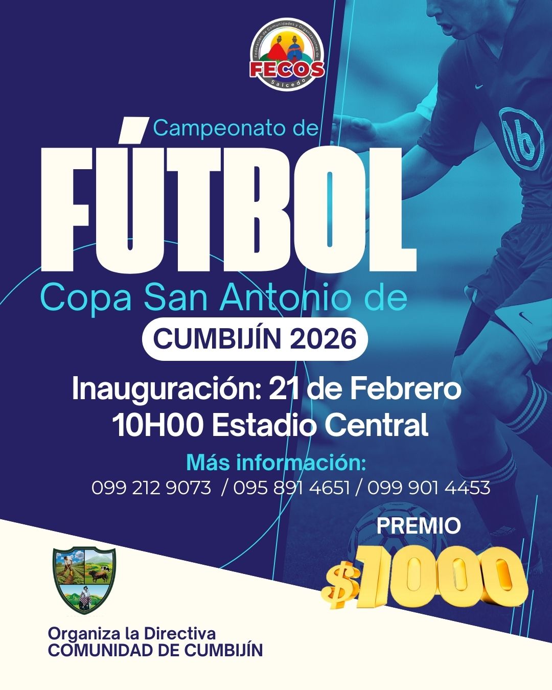 El 21 de febrero se inaugura el campeonato de fútbol masculino en la comunidad de Cumbijín, un espacio de encuentro deportivo y confraternidad que reúne a jugadores y aficionados, con un premio de 1000 dólares para el equipo ganador. Ver publicación #FecosSalcedo #GestiónParaElCambio #ComunicaciónFecos