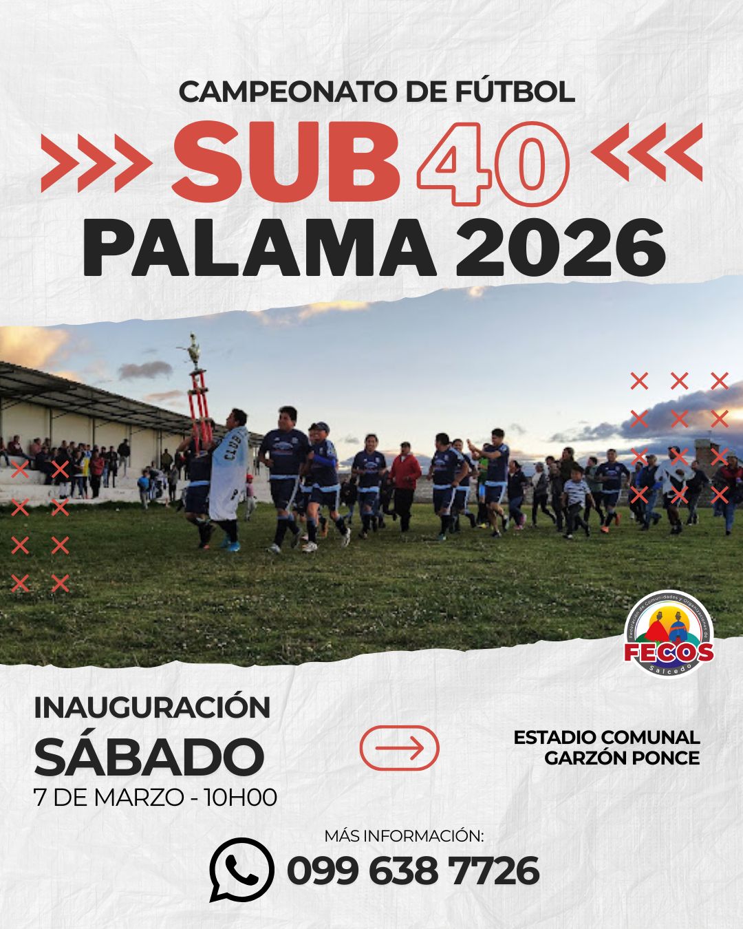 Este sábado 7 de marzo desde las 10h00 se inaugura el Campeonato de Fútbol Sub 40 en el Estadio Comunal Garzón Ponce, un espacio para vivir la pasión deportiva, compartir en familia y fortalecer la unidad de la comunidad de Palama. Ver publicación #FecosSalcedo #Palama2026 #Sub40 #FútbolComunitario #GestiónParaElCambio #ComunicaciónFecos