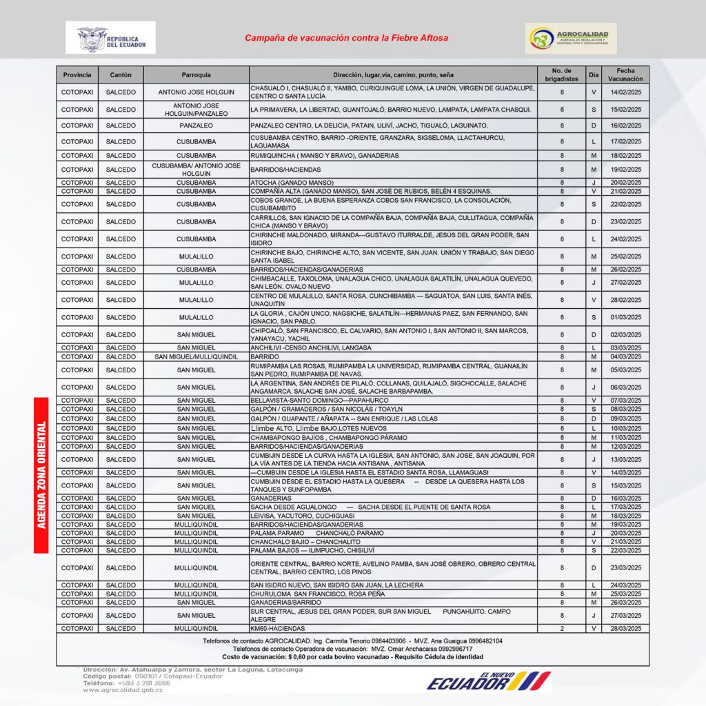 Del 7 al 22 de marzo de 2025 se realizará la Campaña de Vacunación contra la Fiebre Aftosa en comunas y barrios de la zona oriental, conforme a la agenda de Agrocalidad Cotopaxi, con el objetivo de proteger la salud del ganado y fortalecer la producción ganadera. Ver publicación