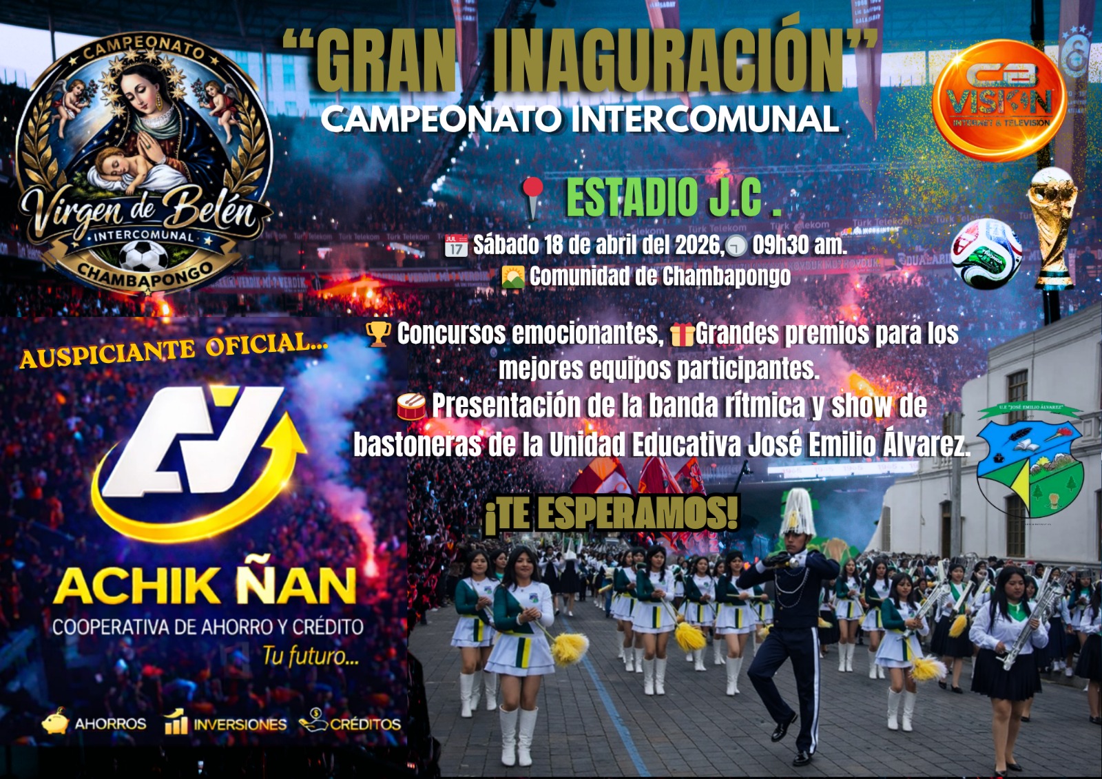 Se anuncia la gran inauguración del Campeonato Intercomunal Virgen de Belén en el Estadio J.C. de la comunidad de Chambapongo. El evento contará con concursos, grandes premios y presentaciones de banda rítmica y show de bastoneras. La jornada deportiva se realizará el sábado 18 de abril de 2026 a las 09h30. Se invita a la ciudadanía a ser parte de esta celebración deportiva y comunitaria. Ver publicación #FecosSalcedo #GestionParaElCambio #ComunicaciónFecos