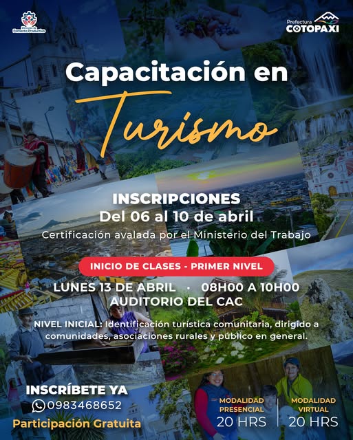 La Prefectura de Cotopaxi, a través de la Dirección de Fomento Productivo, invita a la ciudadanía, comunidades, emprendedores y actores del sector turístico a participar en el Programa de Capacitación Turística 2026. Las inscripciones estarán abiertas del 06 al 10 de abril y la participación es gratuita. Esta iniciativa busca fortalecer conocimientos y habilidades en el ámbito turístico de la provincia de Cotopaxi. Para más información se puede contactar al número 0983468652. Ver publicación #FecosSalcedo #GestionParaElCambio #ComunicaciónFecos