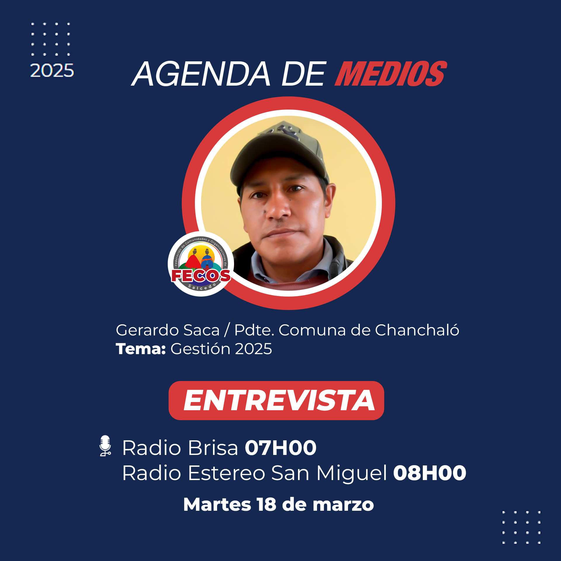 Agenda de medios con Gerardo Saca, presidente de Chanchaló, para dialogar sobre la Gestión 2025 y las prioridades comunitarias. Ver publicación #FecosSalcedo #GestiónParaElCambio #ComunicaciónFecos