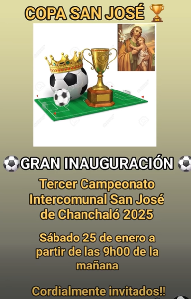 Este sábado 25 de enero, desde las 09h00, inicia la Liga Intercomunal San José de Chanchaló, una cita deportiva que fortalece la unión comunitaria y la pasión por el fútbol local. Ver publicación #LigaSanJosé2025 #FútbolComunitario #UniónYDeporte #FecosSalcedo #GestiónParaElCambio #ComunicaciónFecos
