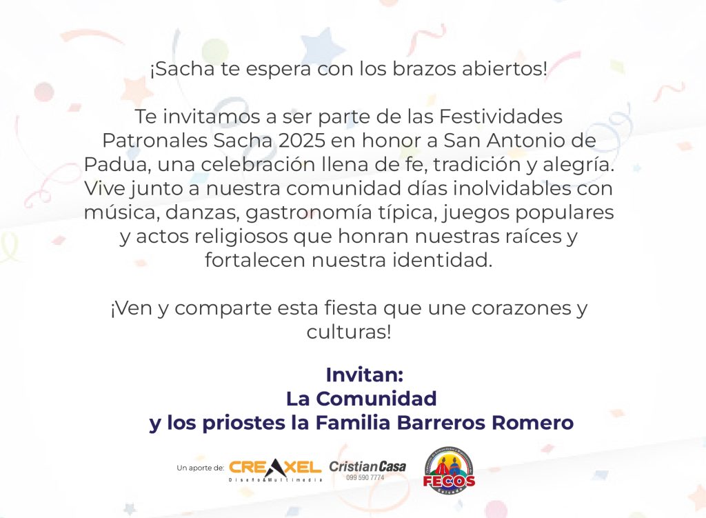 06 Jun Festividades de Sacha 2025 Del 27 al 29 de junio, Sacha celebra sus festividades con danzas ancestrales, música en vivo, gastronomía típica y juegos tradicionales, fortaleciendo la cultura, la tradición y la unión comunitaria. Ver publicación #FecosSalcedo #GestiónParaElCambio #ComunicaciónFecos 0 Informativo
