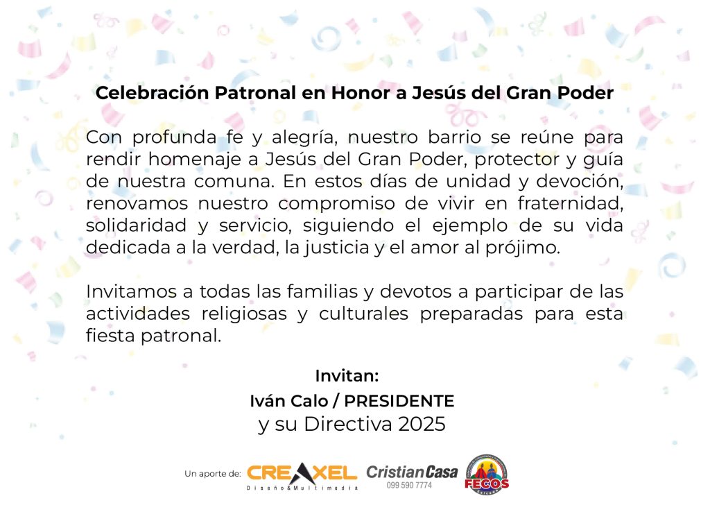 17 Nov Fiestas Patronales en Santo Domingo Del 21 al 23 de noviembre, el barrio Santo Domingo celebra las Fiestas Patronales en honor a Jesús del Gran Poder, uniendo fe, cultura y comunidad con música, danza y actos litúrgicos. Ver publicación #FecosSalcedo #GestiónParaElCambio #ComunicaciónFecos 0 Informativo