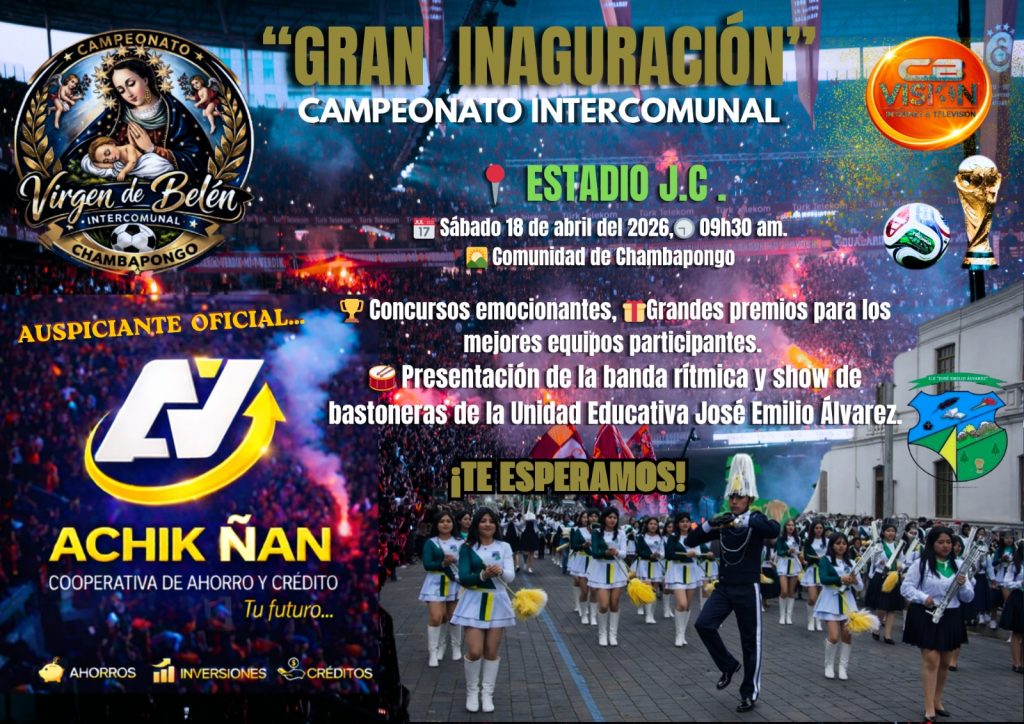 Se anuncia la gran inauguración del Campeonato Intercomunal Virgen de Belén en el Estadio J.C. de la comunidad de Chambapongo. El evento contará con concursos, grandes premios y presentaciones de banda rítmica y show de bastoneras. La jornada deportiva se realizará el sábado 18 de abril de 2026 a las 09h30. Se invita a la ciudadanía a ser parte de esta celebración deportiva y comunitaria. Ver publicación